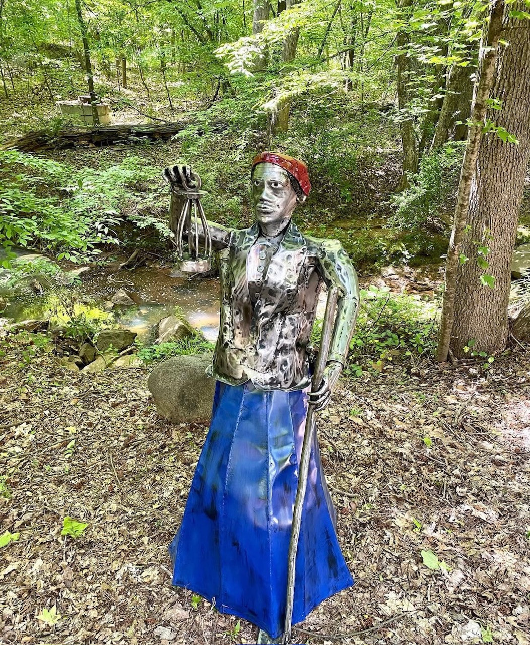Una de las obras más impactantes de Griffin es una escultura metálica a tamaño natural de Harriet Tubman, hecha completamente con paneles que él mismo diseñó en cartón y escaló usando las medidas de su esposa.