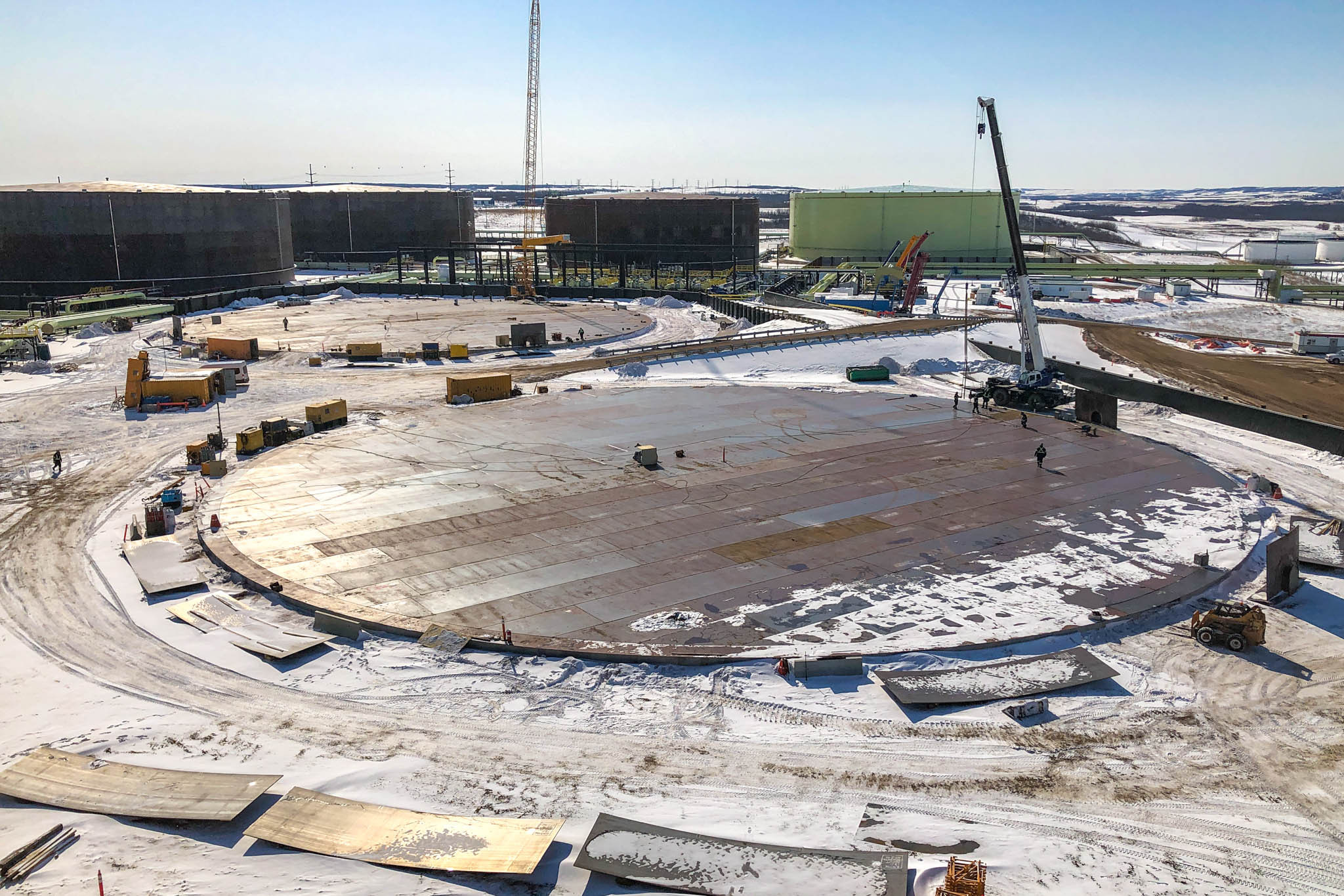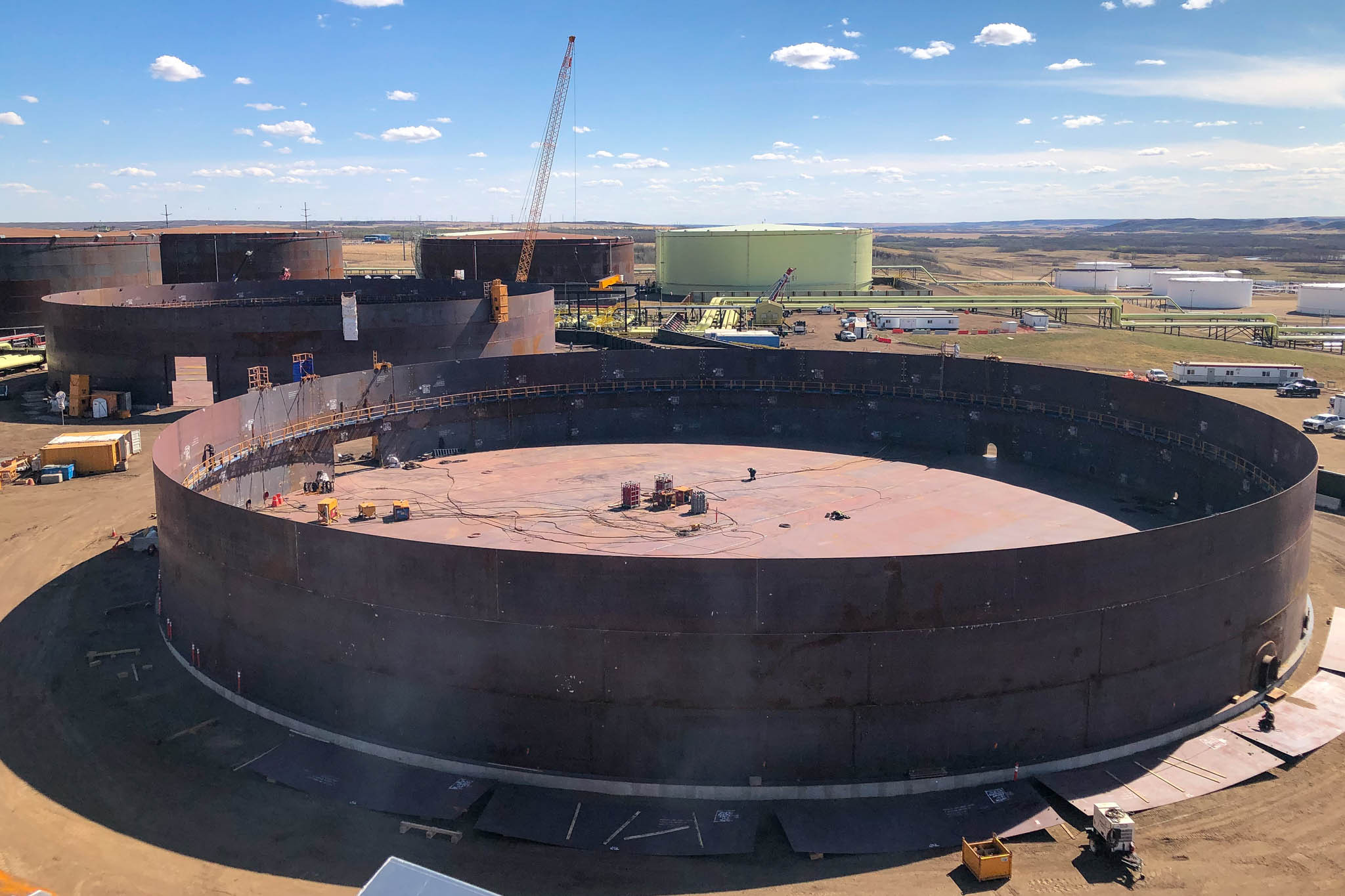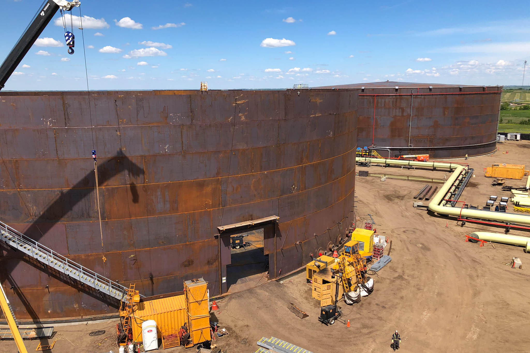En medio del corazón industrial de Alberta, los Boilermakers del Local 555 (Winnipeg, Manitoba) y del Local 146 (Edmonton, Alberta) convirtieron 4,200 toneladas de acero en un millón de barriles de almacenamiento cuando construyeron dos enormes depósitos para TIW Steel Platework Inc.
