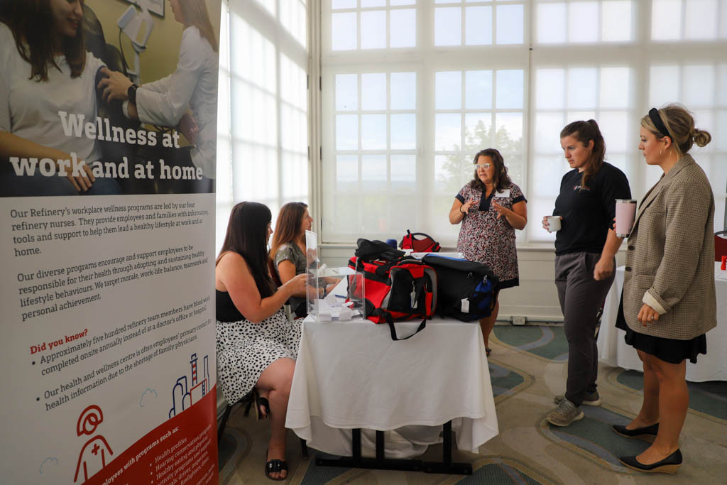 Los participantes en la conferencia charlan en uno de los puestos instalados en la feria de la salud junto al tripartito canadiense.