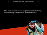 “Tanto [Jessica] como su esposo Tyler son Boilermakers", dijo Jacob Evenson, gerente de negocios y secretario tesorero de la L-627, quien la nominó. "Jessica se afilió al sindicato como madre soltera y ahora tiene una gran trayectoria. Es una orgullosa mujer Diné (Navajo), esposa, madre de dos hijos y trabajadora de la industria de la construcción. Su historia refleja la resiliencia, el crecimiento y el orgullo que definen a una Boilermaker sindicalizada.”