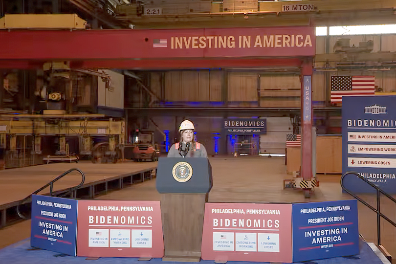El presidente estuvo en Filadelfia para conmemorar la ceremonia de corte de acero del Acadia, un buque de exploración de construcción nacional diseñado para asegurar el lecho marino para las turbinas eólicas marinas. Durante el evento firmó una lámina de acero que será utilizada en la construcción de la embarcación.