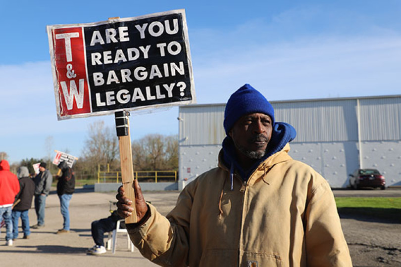 Reed Adams se mantiene firme en el piquete para protestar contra las prácticas laborales injustas de T&W Stamping.