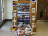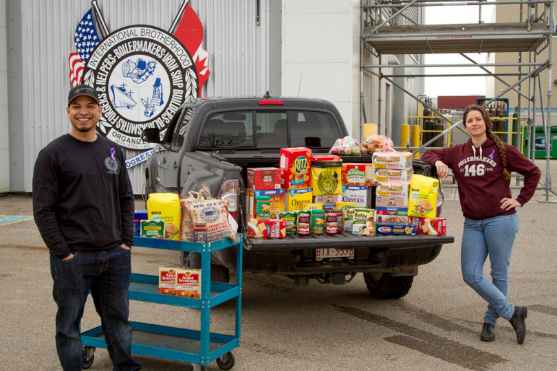 El representante de los Boilermakers de Calgary Steve Warren y la instructora de preaprendizaje Kayla Vander Molen recogen donaciones no perecederas en el salón del L-146 de Calgary para un banco de alimentos local de Calgary.