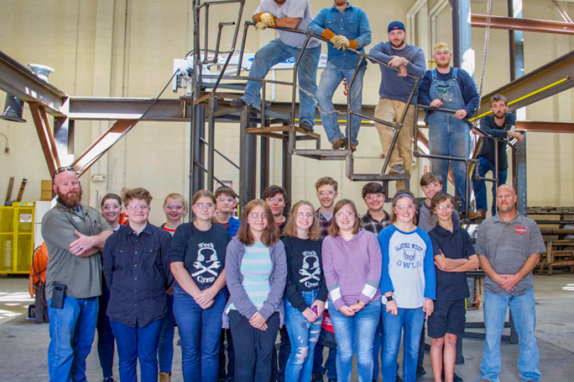LOS APRENDICES DEL Local 83 (Kansas City, Missouri) participaron en la obra “Eurídice” sin poner un pie en el escenario. Veinte aprendices, trabajando en grupos de cinco a ocho personas, fabricaron una elaborada escalera para el escenario de la obra teatral de otoño de Olathe West High School. El gerente de negocios-secretario tesorero del Local 83 Scot Albertson dijo que el proyecto de 150 horas de duración fue una lección de la vida real en la fabricación, porque los aprendices tenían que mirar el dibujo de la escalera y luego construirla.