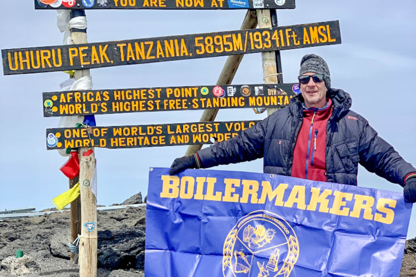 Llegar a la cima valió la pena. La vista de la montaña era notable, con nubes que parecían algodón. E incluso en la cima de una de las montañas más altas del mundo, Gototweski tenía en mente su sindicato. Posando con el cartel de felicitación de finalización en Uhuru Peak, sacó su bandera de Boilermakers Local 13 (Filadelfia).