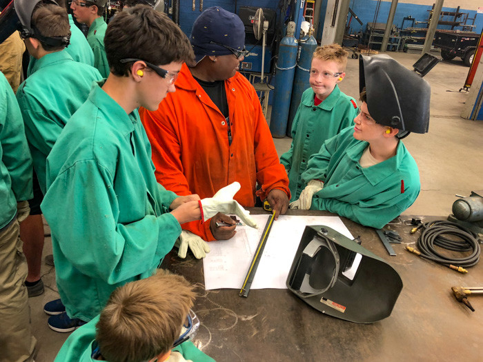 Los Scouts midieron los materiales de construcción precortados y los combinaron con la información del plano. Después de que cada explorador se colocara un equipo de protección personal, se turnaron para soldar y adaptar el polipasto.