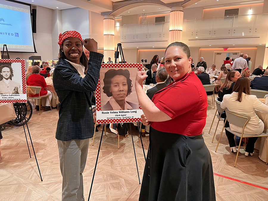 Rennae Ross y Angel Greer, miembros del Local 549 (Pittsburg, California), asistieron a la ceremonia y a la cena de celebración, donde entregaron réplicas de medallas, obsequiadas a las Rosies por el Local 549 y el Local 92 (Los Angeles).