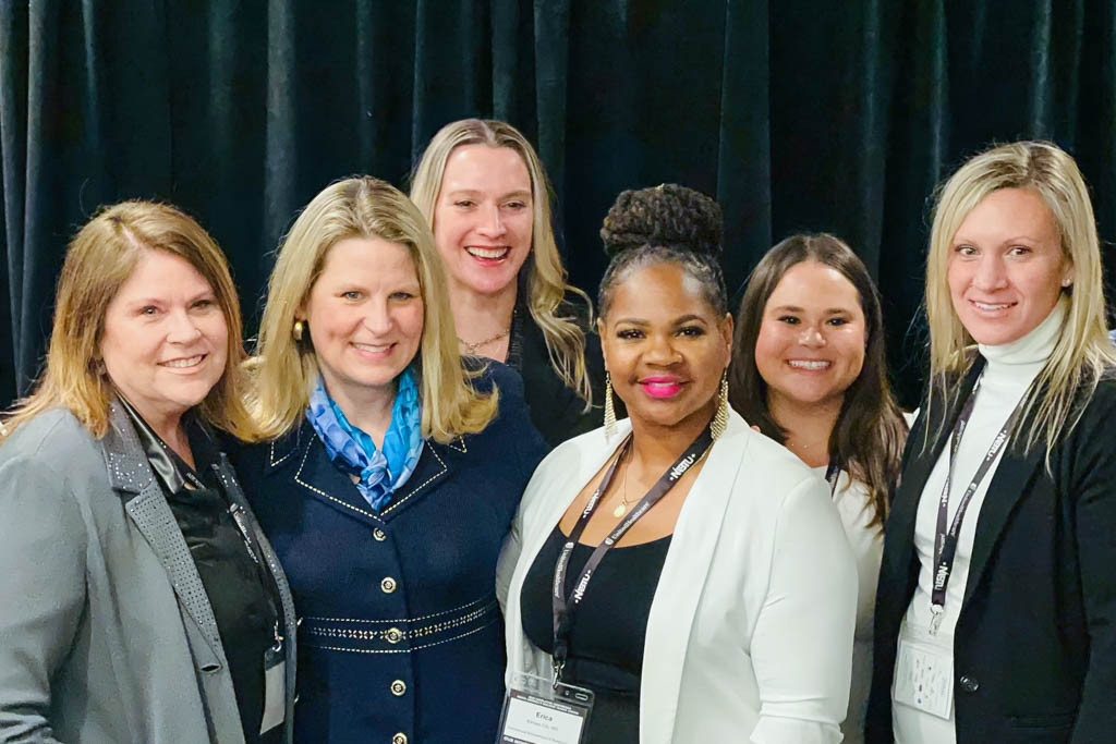 La representante internacional Érica Stewart, en el centro a la derecha, se prepara para acompañar a la presidenta de la AFL-CIO, Liz Shuler, a la izquierda de Stewart, al podio durante la conferencia legislativa anual de NABTU como parte de una delegación especial de mujeres del sector. Stewart es coordinadora nacional de las Iniciativas de las Mujeres en los Oficios y miembro del L-693.