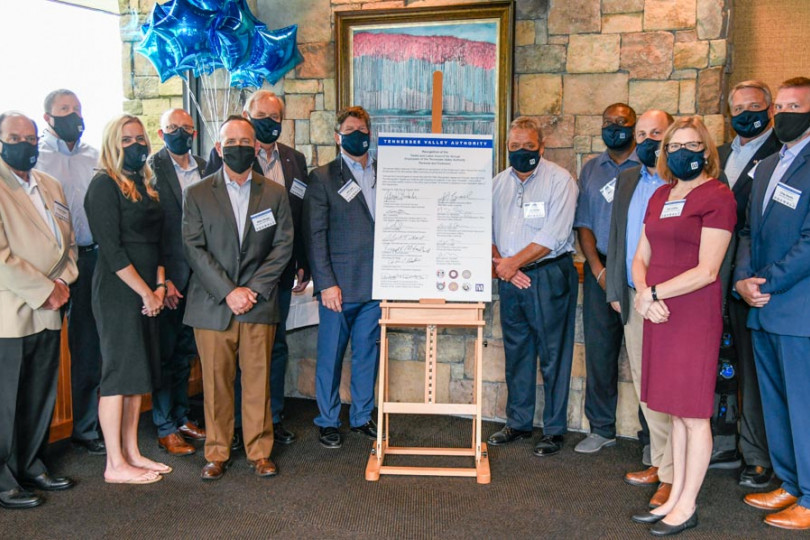 Los representantes tanto de TVA como de los sindicatos promueven su asociación con una extensión del contrato de diez años. A la izquierda del cartel, primera fila de izq. a der., Megan Flynn y Mike Skaggs. Fila trasera de izq. a der.: David Tolley, UA; Brandon Bishop, administrador del Consejo por Hora; Curtis Sharpe, IBEW; David Beckler, administrador del Consejo Anual y Jeff Lyash, TVA. A la derecha del cartel, primera fila, Sue Collins, TVA. Fila trasera de izq. a der., el representante internacional Dusty Garmon; Mark Holt, Laborers; Will Trumm, TVA; Keith McFarland, Machinists and Chip Shotts, Ingenieros de Operaciones.