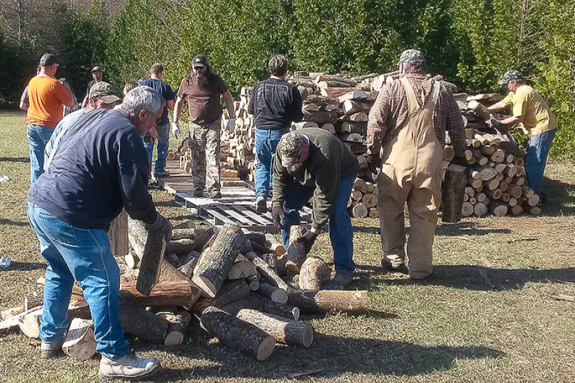 MIEMBROS DEL LOCAL D351 y otros voluntarios apilan leña para Wayne Woloszyk en Posen, Michigan.