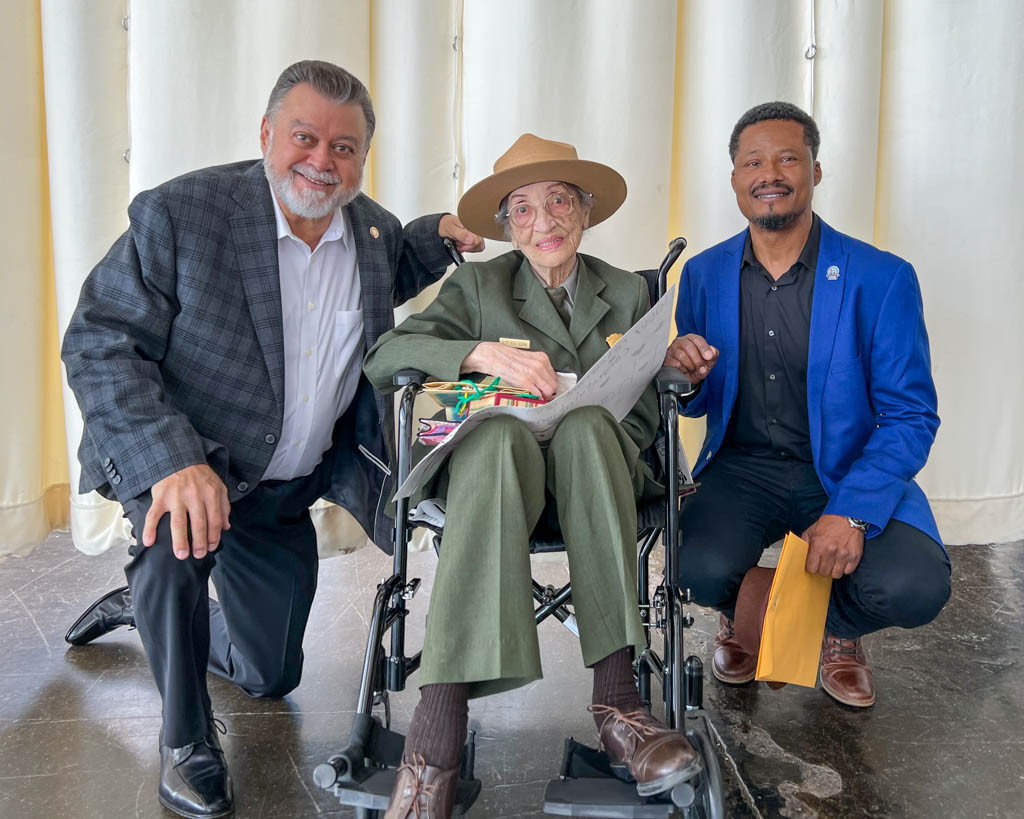 Rosie the Riveter icon, civil rights activist and America's oldest National park Service ranger, Betty Reid Soskin, announced her retirement this past April. Soskin, who is a Boilermaker and worked as a file clerk at the Kaiser Shipyards in Richmond, California, retired at age 100. She was a member of a wartime auxiliary lodge at the shipyard. Pictured with Soskin to celebrate her retirement are, l. to r., IVP-WS J. Tom Baca and IR Tim Jefferies.