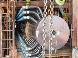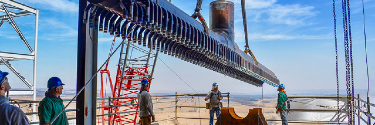 Boilermakers position a reheat outlet header onto a trolley assembly. Left to right, Vitaliy Shevchenko, Vasiliy Shevchenko, Charlie Clark, Jared Brindley and Wade Adams.