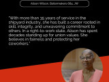 Alison Wilson from Local 684 (Norfolk, Virgina), has more than 35 years of service in the shipyard industry. She has built a career rooted in skill, integrity and unwavering commitment to others. In a right-to-work state, Wilson has spent decades standing up for union values. She believes in fairness and protecting her coworkers.