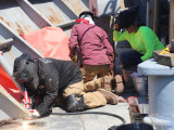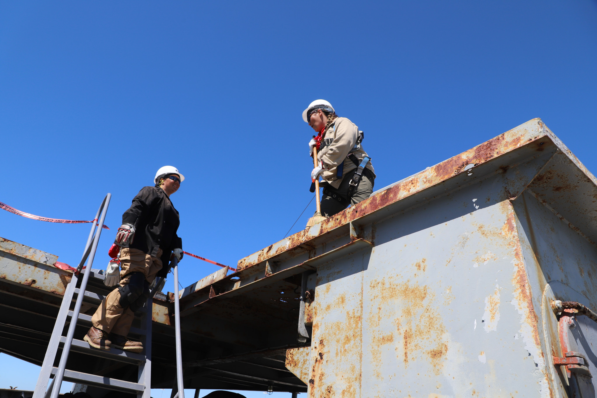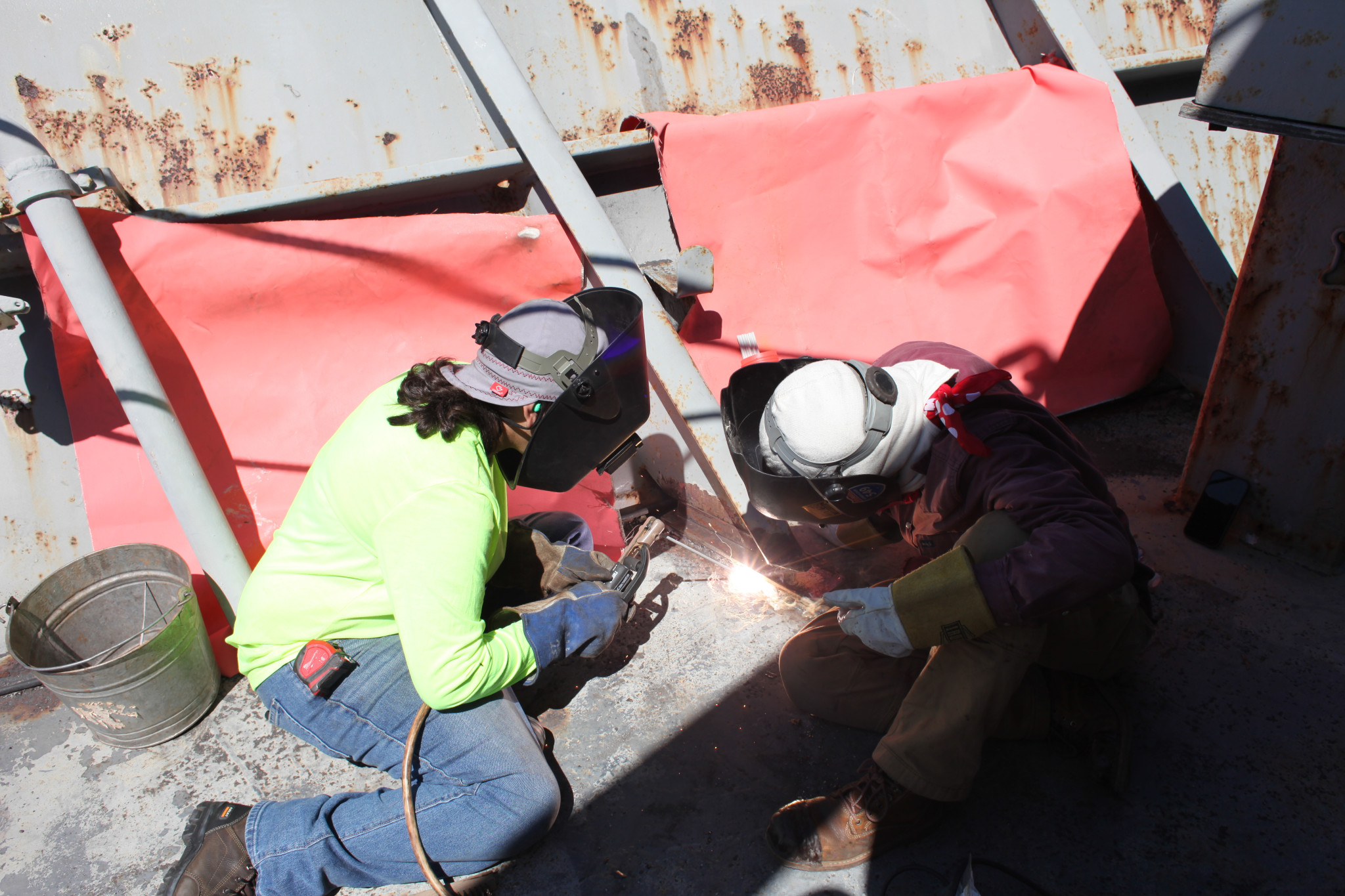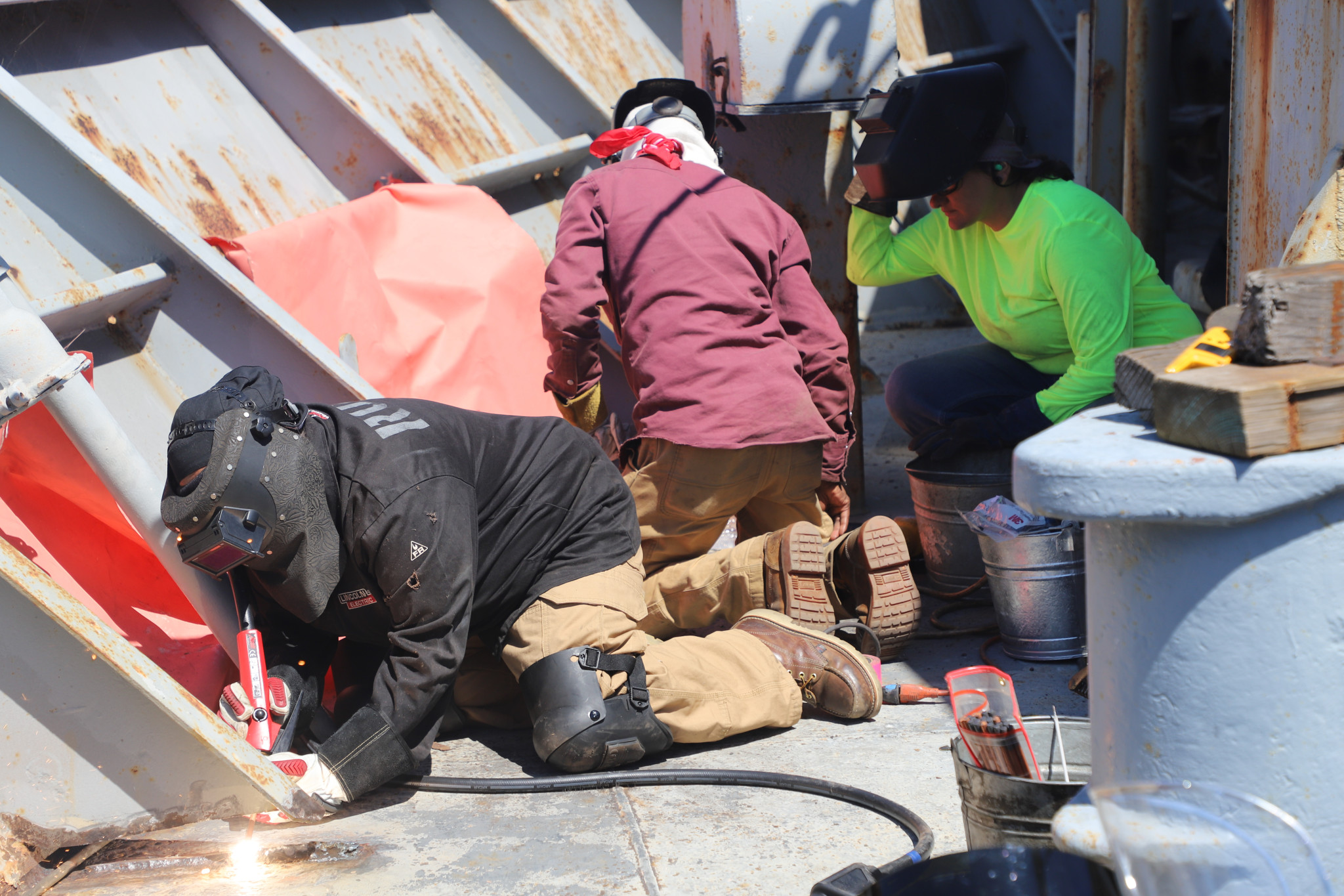 Modern-day Rosies, including Boilermakers, Pipefitters, Ironworkers and members of the pile-drivers’ union, among others and including a few men, started demolition, dismantling old railings, tearing out rust-eaten patches, and lowering pieces from the ship by rope—all under the leadership of Ross serving as foreman. Then the next phases began: cutting out gussets, adding repatch, sanding, grinding and, of course, welding. Lots of welding.