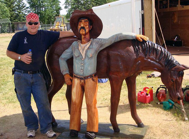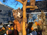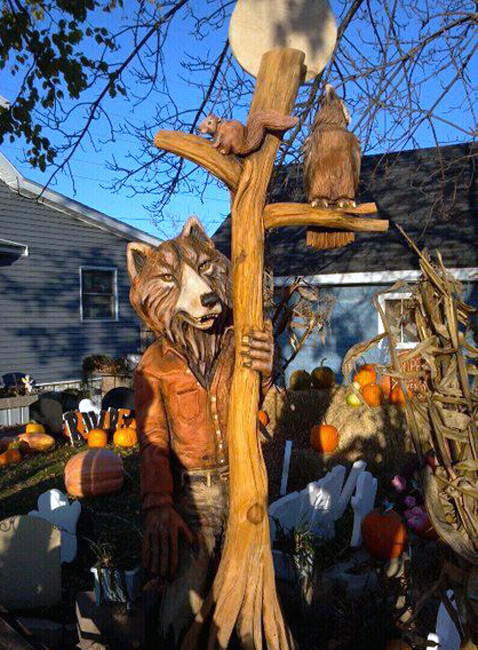 A WOLFMAN PEEKING around a tree, an Indian brave lifting an eagle, a gnome surrounded by wildlife — these are some of the amazing creations of L-169 (Detroit) retiree Jim Denkins, an artist who brings ideas to life with a chainsaw and wood.