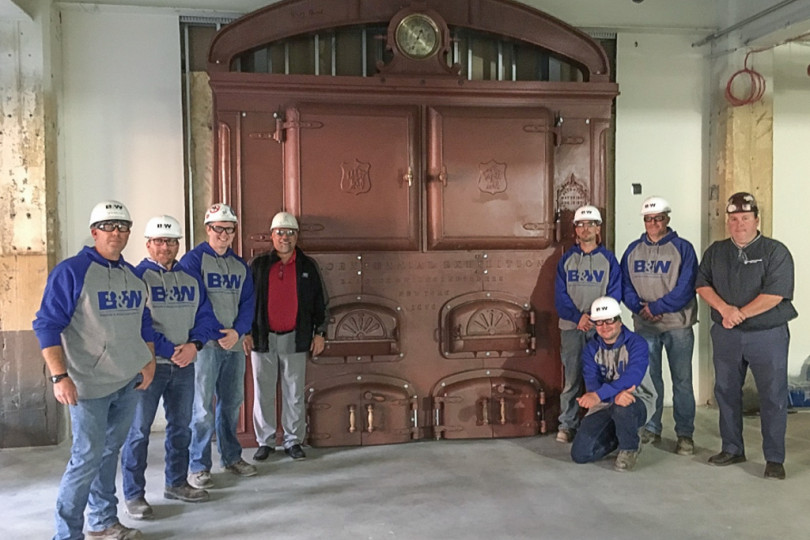 MEMBERS OF LOCAL 744 (Cleveland, Ohio) helped rig and mount the façade of a 150-horsepower cast iron front boiler built in 1876 by Babcock & Wilcox in the lobby of the company’s new corporate headquarters in Akron, Ohio.