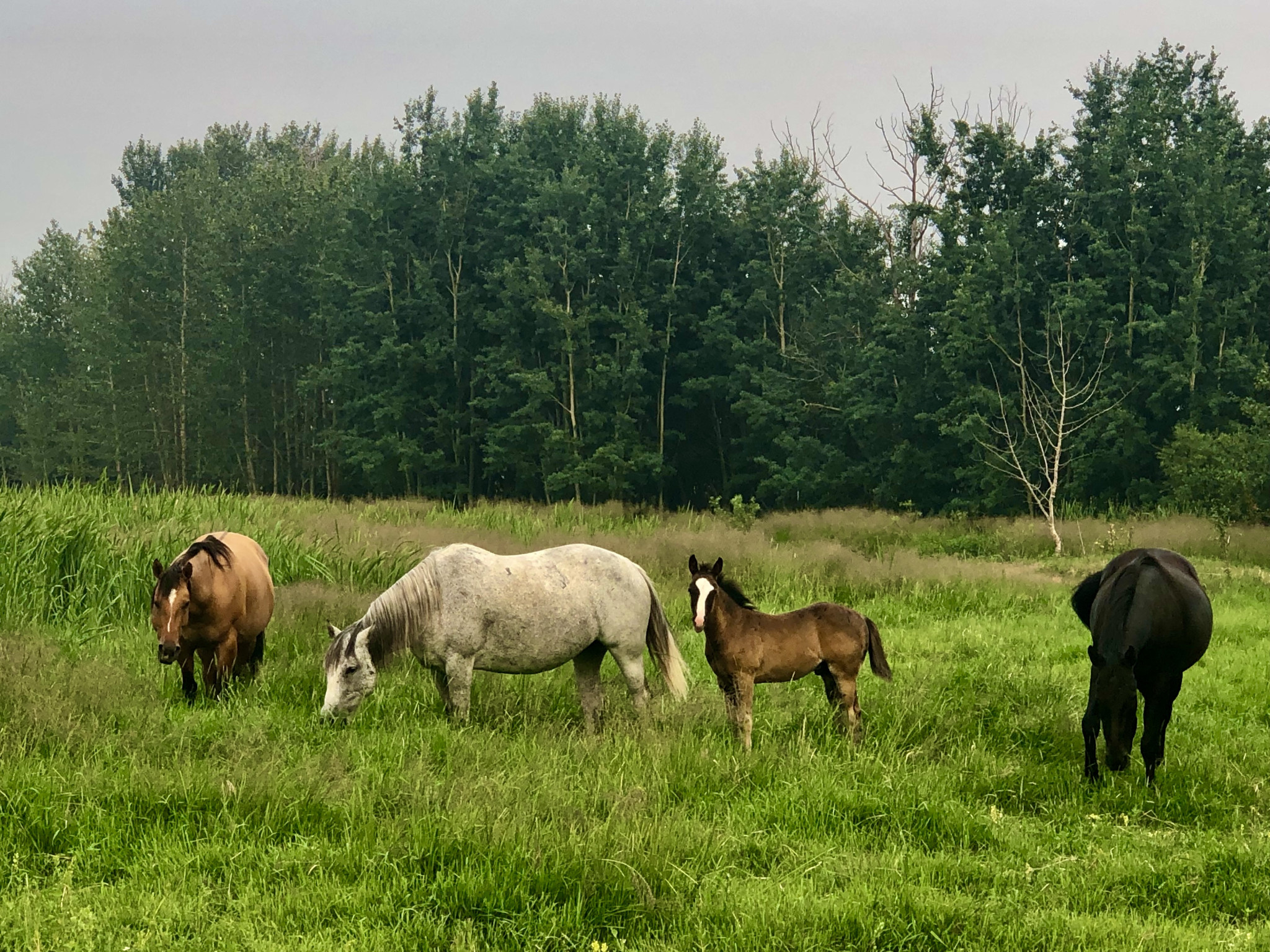 “We took in a mare and a two-week-old foal. They came from Horse Heroes Rescue, who was able to stop them from going for meat,” says Bevan. “A few months later, we took in two more mares who were in rough shape and also headed for meat, one of whom was pregnant. Unknown to us at the time, the first mare who came with the foal was also pregnant, and ten months after she moved in, Henry was born. Henry has been such a gift: he’s so laid back and kind, very smart, and has added so much life to the herd.”