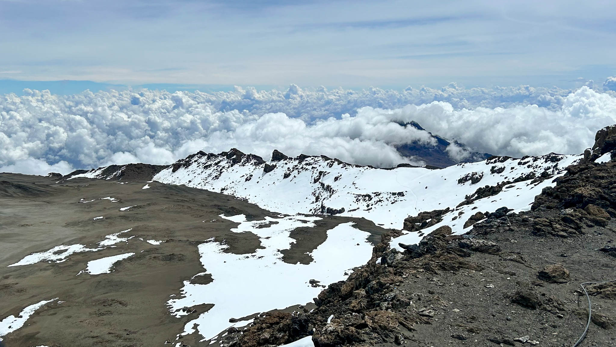 Reaching the top was worth the struggle. The view over the mountain was remarkable, with clouds that resembled cotton. And even at the top of one of the highest mountains in the world, Gototweski had his union in mind. Posing with the congratulatory completion sign on Uhuru Peak, he took out his Boilermakers Local 13 (Philadelphia) flag.