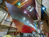 L-696 Boilermakers constructed LCS 7 in Marinette Marine’s cavernous assembly building. In late June, the vessel was transferred out of the building via several hydraulic transfer lifts and later raised into position for a sideways launch.