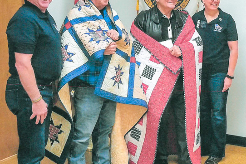Two retired L-60 members receive a handmade quilt from the non-profit Quilts of Valor to thank them for their service during the Vietnam War. L. to r.: Rod Johnson, L-60’s John Williams and Jack Cooper, and Terry Johnson.