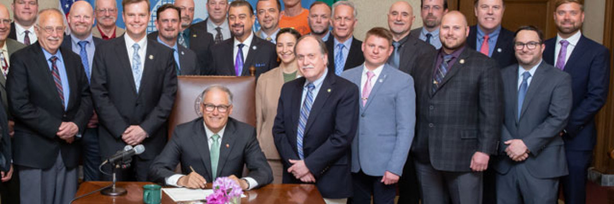 Washington Gov. Jay Inslee signed ESHB 1817 into law on May 8, 2019. Attending the signing were State Rep. Mike Sells, primary sponsor of the bill and chair of the Committee on Labor and Workplace Standards. Also attending were state senators Rebecca Saldaña, Jesse Salomon and Steve Conway; Washington State AFL-CIO President Larry Brown; WBCTD Legislative Director Neil Hartman; WBCTD Executive Secretary Mark Riker and Luke Esser, government affairs. The Western States Boilermakers attending were IVP-WS J. Tom Baca; IR-CSO Mark Keffeler; WS M.O.R.E.-WO/IR Erik Seaberg; WS M.O.R.E.-WO/IR Trent Sorensen; WS M.O.R.E.-WO Mircha Vorobets; L-242 BM-ST Luke Lafley and L- 502 BM-ST Tracey Eixenberger.