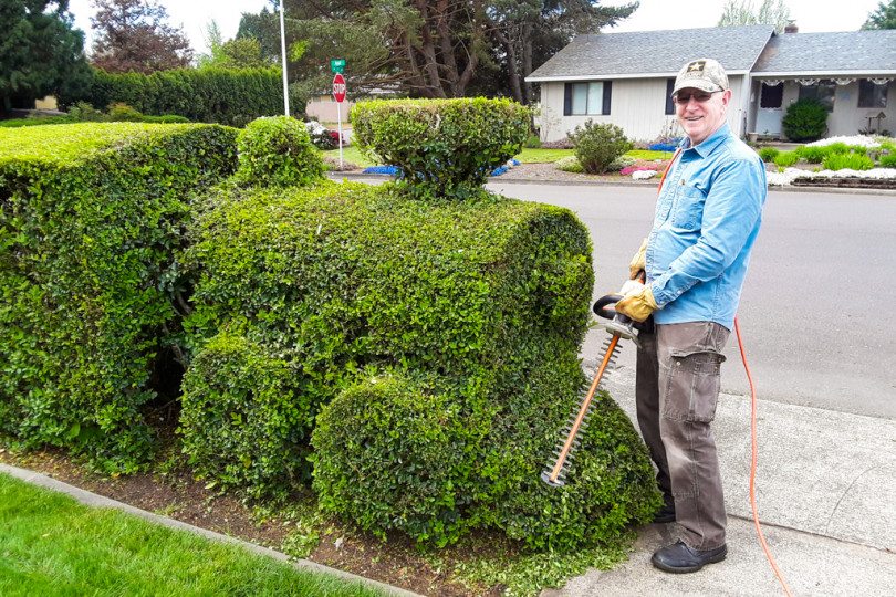 “It’s a good source of exercise—lots of deep knee bends and shoulder movements,” he says. In four decades, he’s gone through about five trimmers—the last two have been professional grade. “My wife and I debate what to do, because the hedge is getting bigger, and I’m getting smaller. I keep threatening to put a fence in, but she says ‘no.’”