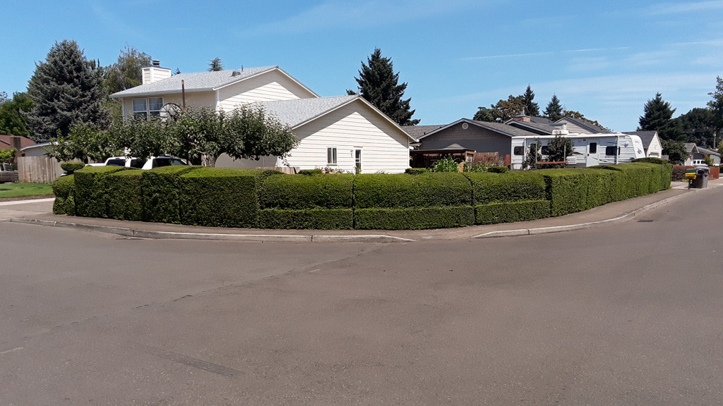 Over the years, the hedge has sometimes taken a beating, from the five Bemis boys and their friends’ backyard activities—soccer balls kicked through, kids attempting to hurdle over it and the like—to, most recently, vandalism. But it’s always grown and been shaped back.