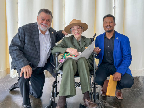 Betty Reid Soskin, icono de Rosie la Remachadora, activista de los derechos civiles y la guardabosques más antigua del Servicio de Parques Nacionales de los Estados Unidos, anunció su jubilación el pasado mes de abril. Soskin, quien es una Boilermaker y trabajó como archivista en los Astilleros Kaiser de Richmond (California), se jubiló a la edad de cien años. Fue miembro de una logia auxiliar de guerra en el astillero. En la foto con Soskin celebrando su jubilación están, de izq. a der., el vicepresidente internacional de los Estados Occidentales, J.