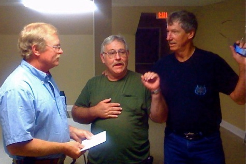 LOCAL 37 (NEW ORLEANS) Vice Pres. Lionel Hanna (l.) swears in newly-elected officers Richard Moity (c.) and Alan Melton, trustee. Moity, formerly a trustee, was elected to complete the term of president for John Anderson, who passed away March 8.