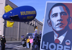 Boilermakers have been active across Pennsylvania but have concentrated in recent days in Philadelphia. On April 17, a Boilermaker contingent rallied just outside the National Independence Center, where Sens. Obama and Clinton squared off in what may have been their final debate. The Boilermaker blimp has advertised the union’s endorsement of Obama on busy street corners along Independence Mall. Local 19 Vice President Fred Chamberlain has coordinated much of that activity and has been assisted by the Boilermakers Government Affairs Department.