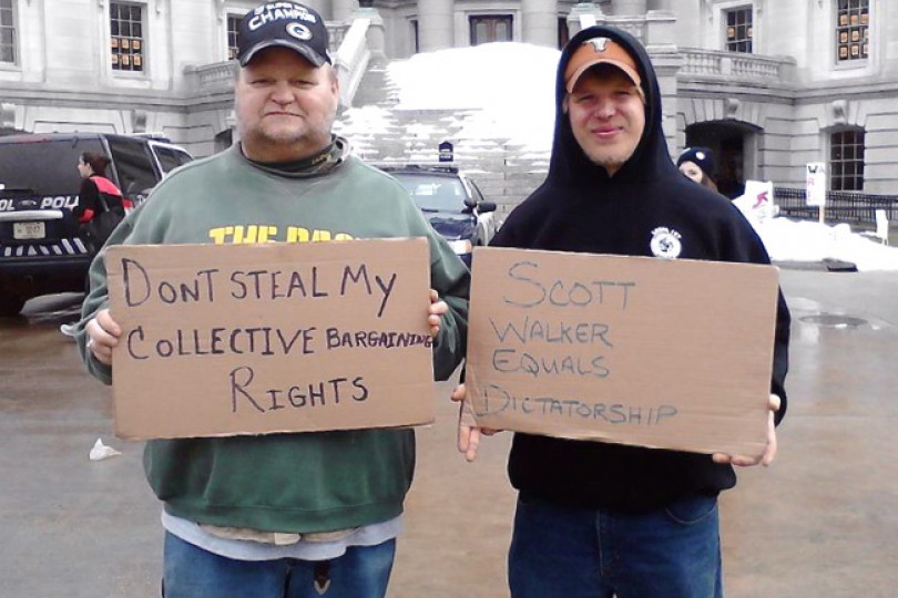 Gov. Scott Walker of Wisconsin and Gov. John Kasich of Ohio — both elected last November — have come under fire for attempting to neuter public worker unions in the name of budget reductions. Proposals that would prevent public workers from bargaining collectively are now under consideration in both states. Tens of thousands of protesters have flooded the capitol in Wisconsin. Large groups have also rallied at the Ohio Statehouse in Columbus.